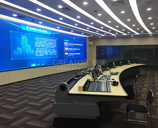 针对项目的应用需求,我们设计了一套以PRO-MAX288288、PRO-MAX144144混合拼接高清矩阵为核心,中央控制系统CR-PGMIII搭配15英寸真彩色触摸屏CR-LAN15相结合的音视频一体化解决方案。项目主要负责北京第二中级人民法院图像中心、大要案会议室图形图像信号的整体建设。以一台PRO-MAX288288、一台PRO-MAX144144装备法院图像中心,上百个法庭的信号均可通过光纤快速传输,矩阵无缝切换显示在LED大屏上。大要例会议室配备一台PRO-MAX144144,综合管理大案件音视频素材,方便领导观看审核。项目打造出一个公正透明、信息化工作的智慧法院系统。
