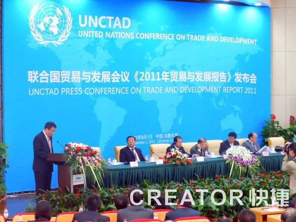 国家商务部副部长傅自应和联合国贸发会议秘书长素帕猜?巴尼巴滴出席会议并发表讲话。