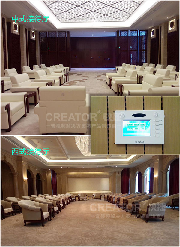 而在控制系统方面,高性能网络化可编程中央控制主机CR-PGMШ,其功能强大,系统稳定,操作简单,具备超强的扩展性,采用嵌入式4.3英寸有线触摸屏MT-430W作为人机交互平台,轻松一键,随时控制会场所有声光电设备,如控制门禁开关、灯光开关及明暗度调节、模式切换、大屏显示开关、会议系统开关等。佛山商务中心每间会议室、中西式接待室安装该系统高达54套,极大方便了对会议室的管理。