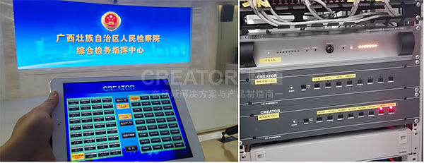 CREATOR快捷图形图像智能化数字综合管理平台是针对指挥控制中心、大型会议室、视频会议室等研发设计的新一代音视频一体化解决方案。既具备传统矩阵的信号管理功能,同时还拥有完美的信号拼接功能,广西壮族自治区检察院可根据对信号的实际需求进行个性化切换显示。