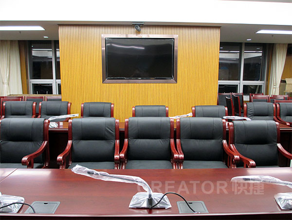 会议室配有:前后共2个摄像机、59个会议发言单元、3个高清电视机。