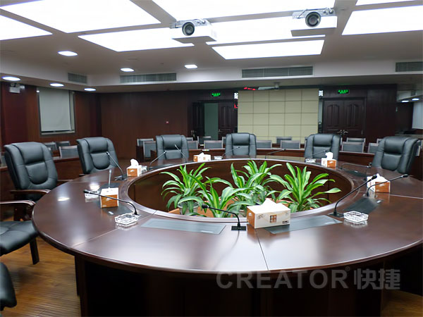 该会议室设计上采用圆桌会议形式,会议室面积约为100㎡,可容纳80-100人,CREATOR快捷提供的智能会议室应用解决方案在整体上实现了会场的信号管理切换、中央控制、智能会议间完美协作。