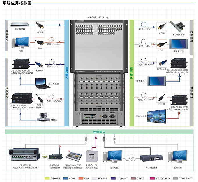 下图为现场展出的数字网络混合插卡矩阵CROSS-MAX3232的应用拓扑图: