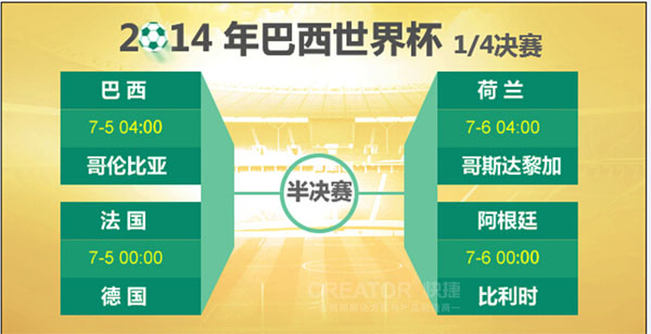 就目前小编的统计,这八个队伍各有支持者,其中,以东道主的巴西暂居首位,支持者逾半数,德国、阿根廷、荷兰紧随其后。其他球队能逆袭成功吗?球场上瞬息万变,大力神杯新主仍悬念高挂,激烈的比赛接下来只会更加激烈,"猜大力神杯新主 拿CREATOR快捷iPad大奖"活动也不停歇。赶紧加入我们,参与第一轮冠军竞猜活动,拿CREATOR快捷的iPad吧!在以下世界杯的八强队伍中,将"你的冠军球队"通过微信(微信号:gzcreator)发给我们!