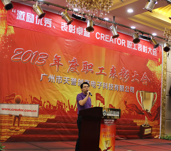 CREATOR快捷总经理王国孟先生为本次表彰大会致开幕辞,王总表示,"公司发展以人为本,强调人才的重要性,同时也尊重差异性,CREATOR快捷为所有职工搭建广阔的发展平台,为职工提供实现自我价值的事业空间,尊重珍惜职工辛勤劳动的付出。CREATOR快捷将不断谋求与职工的共同发展、携手并进,力争成为全球顶级的音视频解决方案与产品制造商。"