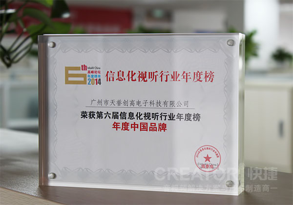 11月7日,第六届信息化视听行业高峰论坛暨2014年行业年度榜发布典礼在深圳盛大召开。作为音视频解决方案与产品制造商的广州市天誉创高电子科技有限公司(以下简称:CREATOR快捷)出席该盛会,并在颁奖典礼上捧得"年度中国品牌"奖项。